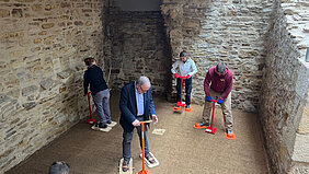 Der Boden, erzählen Philipp Stute vom Architekturbüro Wulf und Melissa Acker von der Hochschule für Technik, die den Praxisworkshop initiiert und organisiert haben, passt nicht nur perfekt zur historischen Kulisse der wuchtigen Kellermauern aus dem 13. Jahrhundert, sondern auch zu den hohen Ansprüchen der Gegenwart: "Lehm ist einer der umweltschonendsten Baustoffe". Überdies könne er Feuchtigkeit aufnehmen, Gerüche binden und für ein angenehmes Raumklima sorgen, erläuterte Architekt Tobias Wulf dem sichtlich begeisterten Oberbürgermeister.