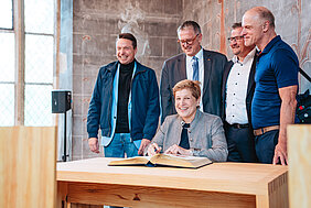 Nicole Razavi, Ministerin für Landesentwicklung und Wohnen Baden-Württemberg, hat der Stadt Pfullingen die Städtebauplakette in Bronze überreicht. Die Plakette ist eine Würdigung für abgeschlossene Projekte, die unter beispielhaftem Einsatz von Städtebaufördermitteln historische Substanz mit moderner Nutzung verbinden.